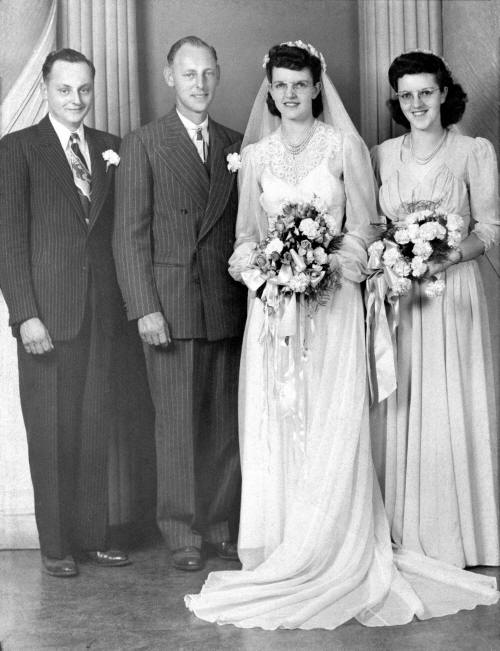At a Nuptial High Mass celebrated by the Rev. Paul Pitzenberger at St. Ann’s Catholic Church, Stanley, June 26, 1947 at 9:30 a.m., Miss Lucy Henke, daughter of Mr. and Mrs. Peter A Henke, Town of Worden (Clark Co., Wis.), became the bride of Bernard Haas, son of Mr. and Mrs. George Haas (Clark Co.).
