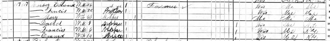 Frank Harvey, boarder, white, male, age 31, single, born in Wisconsin, parents