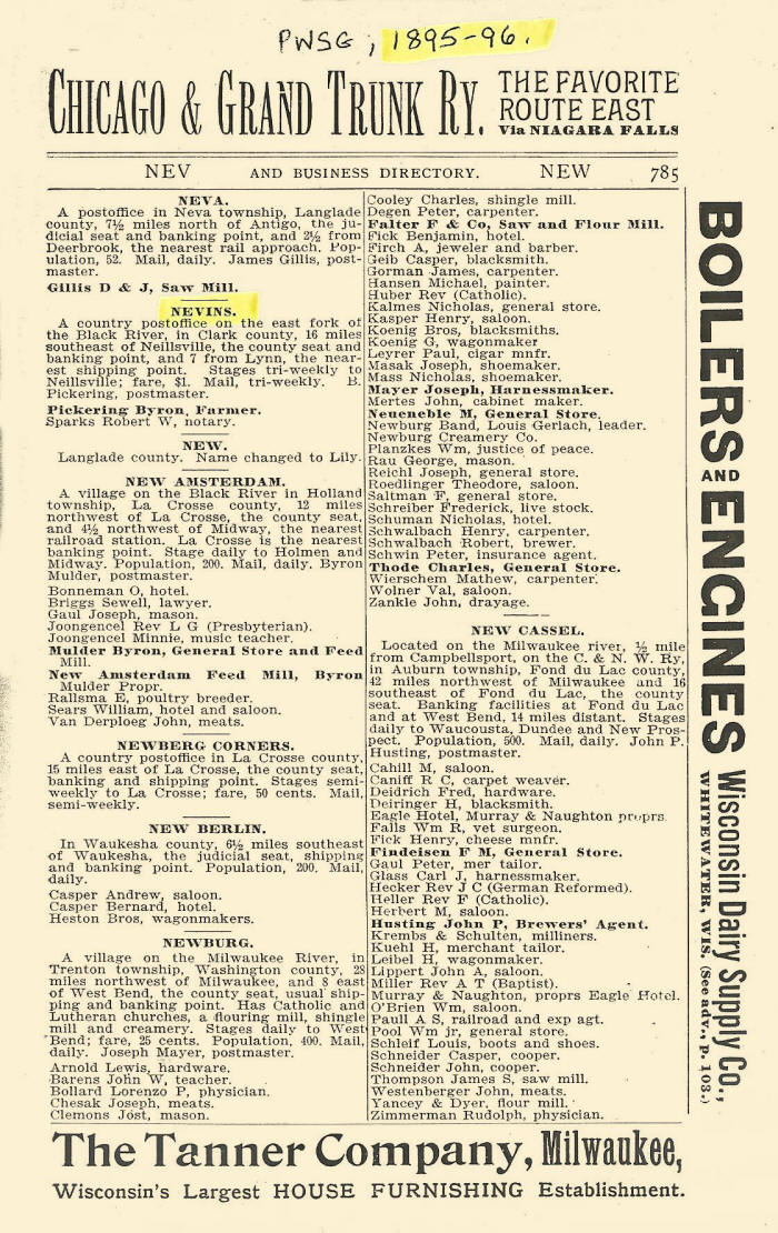 NEVINS--A country post office on the east fork of the Black River, in Clark County, 16 miles southeast of Neillsville, the county seat and banking point, and 7 miles from Lynn, the nearest shipping point. Stages tri-weekly to Neillsville; fare, $1. Mail, tri-weekly. B. Pickering, postmaster. Chicago & Grand Trunk Ry. Directory |