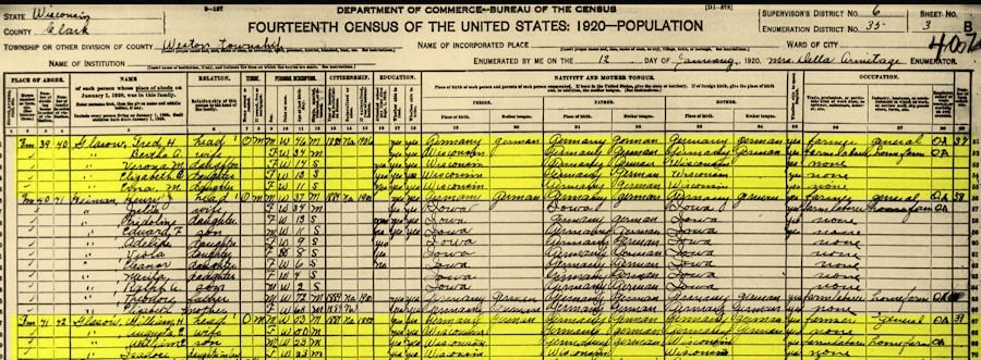 1920 Federal Census, Weston, Clark, Wisconsin, United States