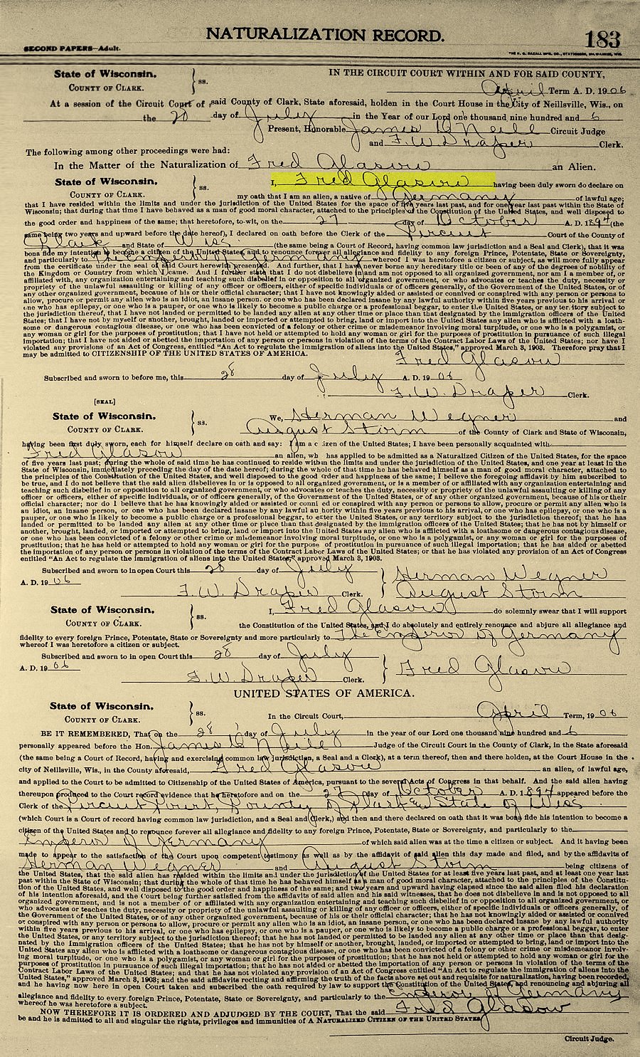 Fred H Glasow Head Male 46 Germany, immigrated 1883, naturalized 1906