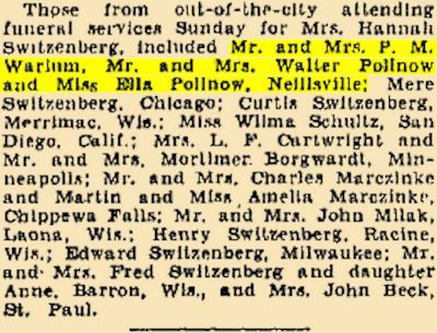 Those from out-of-the-city attending funeral services Sunday for Mrs. Hannah Switzenberg, included Mr. and Mrs. P. M. Warlum, Mr. and Mrs. Walter Pollnow and Miss Ella Pollnow, Neillsville, Wisconsin; Mer Switzenberg, Chicago; Curtis Switzenberg, Merrimad, Wis.; Miss Wilma Schultz, San Diego, Calif.; Mrs. L. F. Cartwright and Mr. and Mrs. Mortimer, Borgwardt, Minneapolis; Mr. and Mrs. Charles Marczinke and Martin and Miss Ameilia Marczinke, Chippewa Falls; Mr. and Mrs. John Millak, Laona, Wis.; Henry Switzenberg, Racine, Wis.; Edward Switzenberg, Racine, Wis.; Edward Switzenberg, Milwaukee; Mr. and Mrs. Fred Switzenberg and daughter Anne, Barron, Wis., and Mrs. John Beck, St. Paul, Minnesota. |