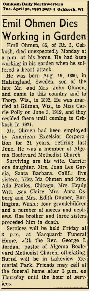 Emil Ohmen, 66, a former resident Thorp (Clark Co., Wis.), passed away at his country home near Oshkosh, Wis., April 29th, 1957, following a heart attack.