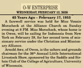 Miss Vonnie Morscheck, who has long been affiliated with the Christian Alliance Church in Owen, has been returned to Indonesia by the Missionary Society of the church.