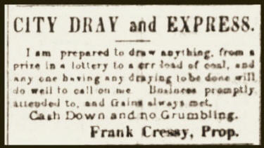FRANK ran an express and dray service which he called the "Knickerbocker Transfer Line" out of an office in his wagon. He ran an advertisement September 22, 1882 in the Spencer paper which read: Baggage and freight transferred in scientific principles. All train met - orders filled on Sundays. Only line in city that gets there by day. He also said, "Cash down - no grumbling." Another advertisement read: I am prepared to draw anything from a prize tottery to a carload of coal. Anyone having any draying to do will do well to call on me. Business attended to promptly. He sold the business in 1883 to Emery Urich.