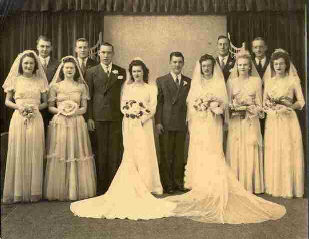 Double wedding of: Richard Matti, Sr. (groom on right center), Geraldine Squires (bride on right center ) and Janice Matti (bride on left center) and Robert Mathews (groom on left center). |