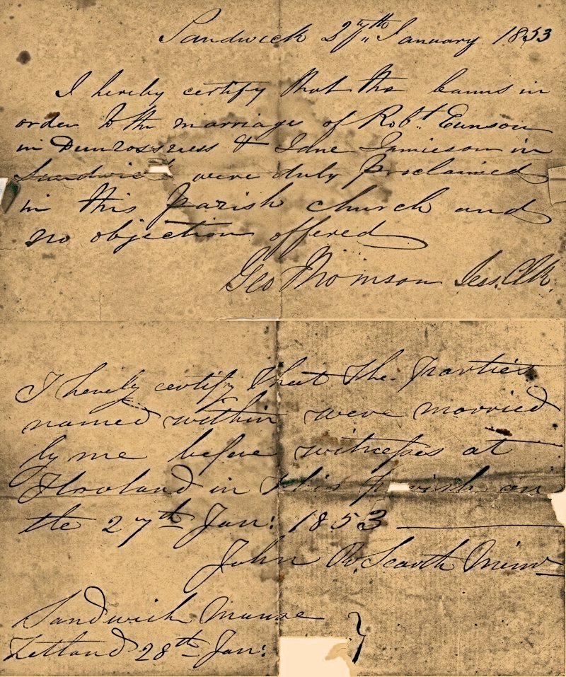 Marriage: 27 January 1853, Dunrossness, Shetland,