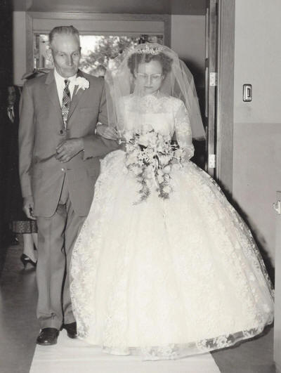 The bride, given in marriage by her father, wore a floor length gown of rose point Chantilly lace over nylon organza with a Sabrina neckline. She wore pearl earrings and necklace, a gift of the groom, and carried a cascade bouquet of white roses and stephanotis.