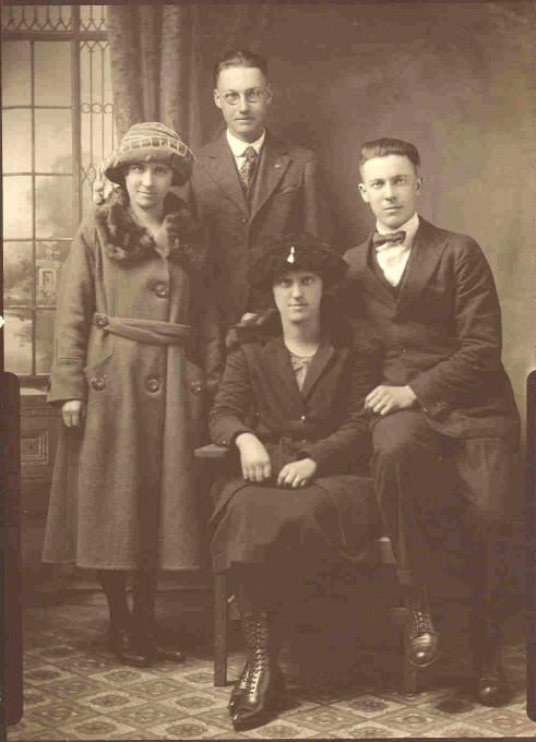 This is a wedding photo of Nellie Dimmitt and Adolf Fred Matti, (Grandparents to Cindy Dressler). They are the couple sitting in the photo. I believe the other woman to be Nellie's sister, Leona and I'm not sure who the gentleman standing is. They were married Nov.8, 1921 at St. Joseph's Catholic Church, Fairview, WI. Adolf was born in Zweisimmen, Switzerland on Jan. 24, 1898 to Jacob and Jeanetta (Bucks) Matti. He came to this country in 1910 on the ship La Lorraine which departed from Le Havre, France. Adolf is buried in the Town of Mentor Cemetery between his brothers, Albert Matti and Armin Matti. Nellie is also buried in the Town of Mentor Cemetery near her sister Mary Ray.