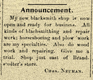 Announcement. My new blacksmith shop is now open and ready for business. All kinds of blacksmithing and repair work; horseshoeing and plow work are my specialties. Also do wood work and repairing. Give me a trial. Shop just east of Branstedter's store. CHAS. NEUMAN. |