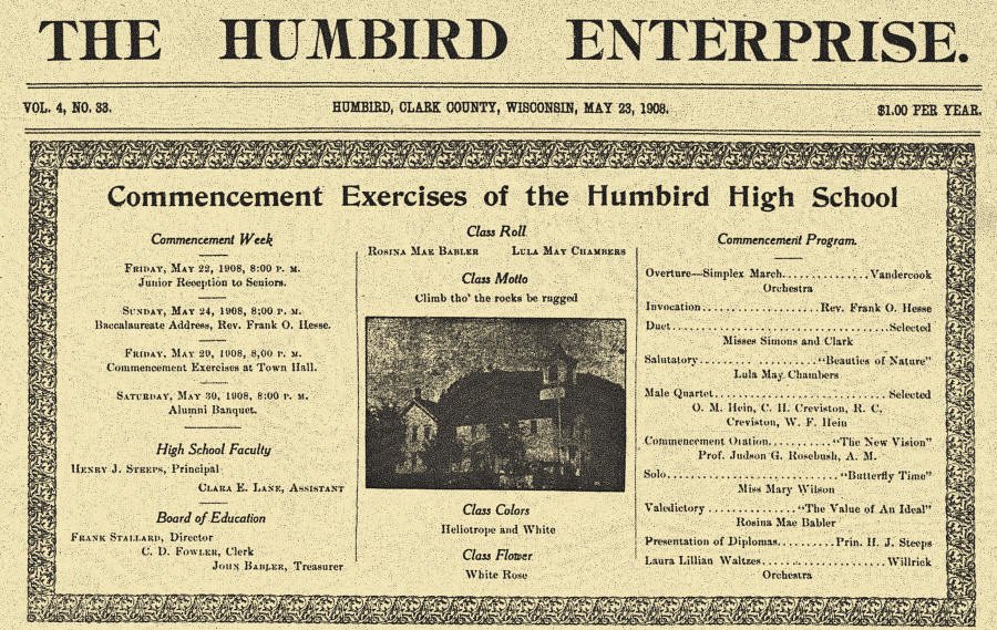 School: Humbird, Wisconsin School Notes (23 May 1908)