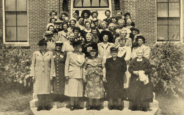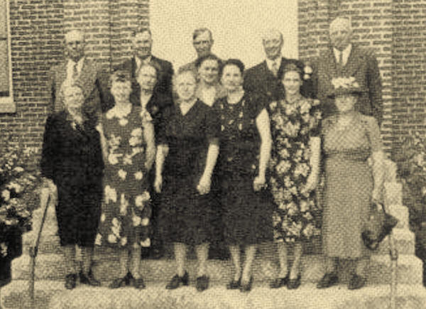 LADIES AID SOCIETY 1st Row: Mesdames William Awe, Theo. Humke, Fred Kuester, Ed Schwarze, Ferdinand Decker, Anna Humke. 2nd Row: Theo Kippenhan, Otto Reineking, Clara Liebzeit, Elmer Kuester, George Humke, Alfred Schwarze. 3rd Row: George Kuester, Arthur Schwarze, Walter Schwarze, Alvin Albert, Hubert Kuehn. 4th Row: Quintin Irvine, August Goeke, Albert Miller, Erwin Toburen, Otto Fravert, Fred Timmler, Fred Brick, Arthur Humke, Arno Miller, William Goeke, William Steiger. 5th Row: Harry Liebzeit, Norman Liebzeit, Fred Kuester, Phillip Vollrath, Ernest Vollrath, Albert Fravert, Norman Kuester, J.C. Klingeberger.