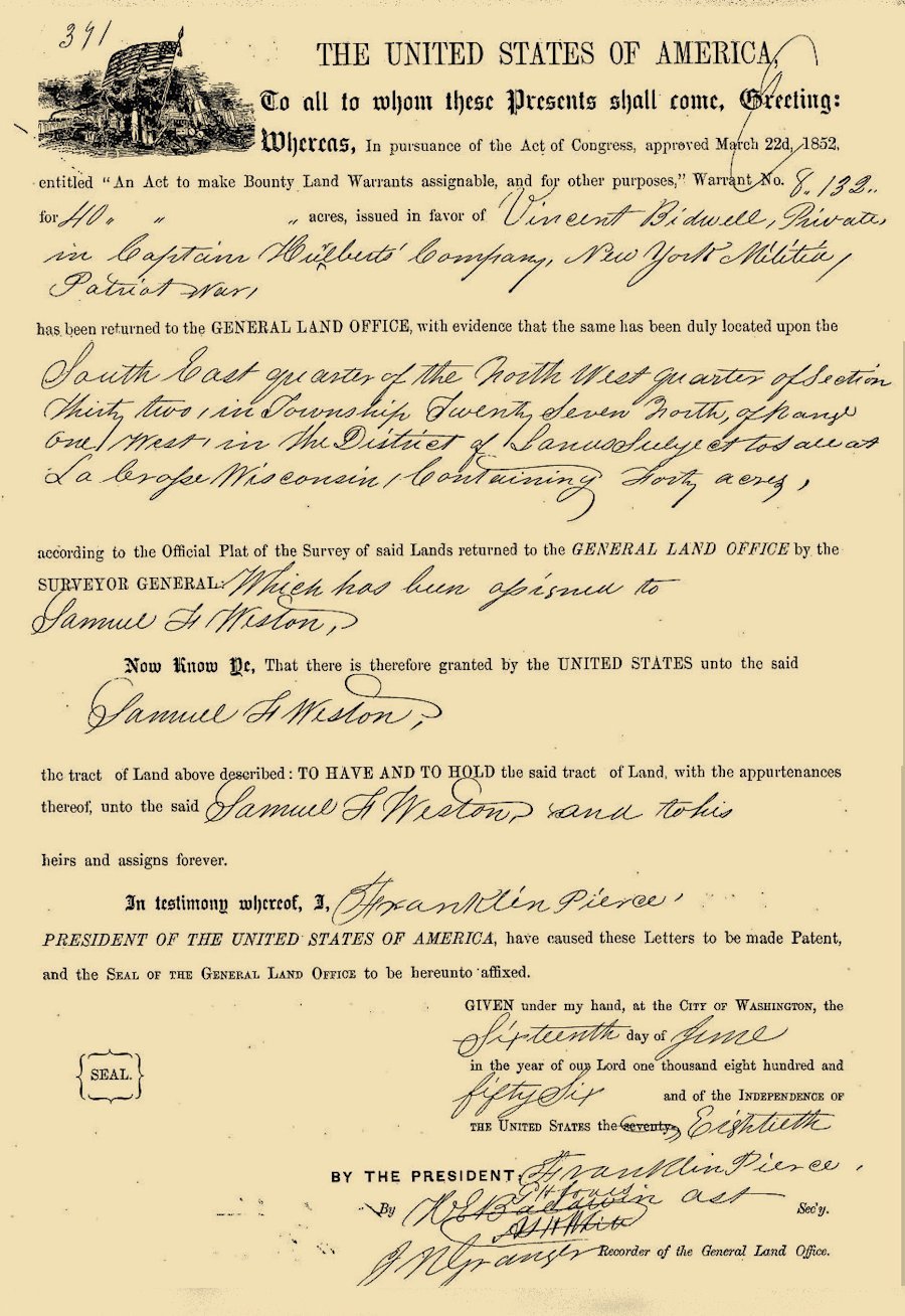 16 June 1856, this same land had been granted to Pvt. Vincent Bidwell, who served in Captain Hulberts' Company, New York Militia, during the Patriot War.