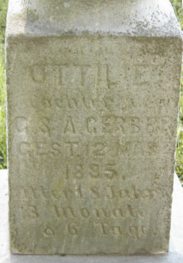 Ottilie Christine Gerber was born 1867 in Maple Works?, Clark Co., Wis., the daughter of Fred and Ann Gerber, and was christened at the Zion American Lutheran Church, Grant Township, Clark Co., Wisconsin. She married Gottlieb Pischer 25 Dec 1883 in Chippewa, Wisconsin. She died 12 Mar 1885 and was buried in the Zion American Lutheran Cemetery. Gottlieb remarried 14 Oct 1885 and his second bride was Bertha Emilie Lautinbach. Gottlieb Pischer died 30 October 1933.