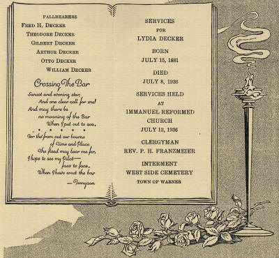 Mrs. Decker was a life long resident of the Town of Warner. She was well known throughout the community and was always willing to aid her friends and neighbors to the best of her ability. She has always been a member of the Immanuel Reformed Church and was also a member of the Ladies Aid Society, serving as president for a number of years.