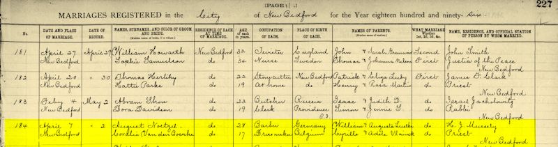Marriage Date: 7 Apr 1896, Priest: Henry J. Mussely of New Bedford (44 yr.