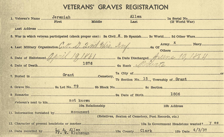 *Jeremiah N. Allen was buried in the Town of Grant Cemetery.