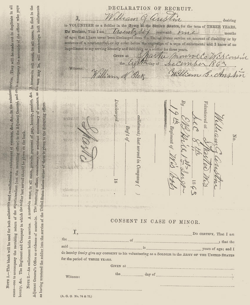 1863 December - from Sparta, enlisted in Wisconsin Infantry, Co. C, 19th Regt.