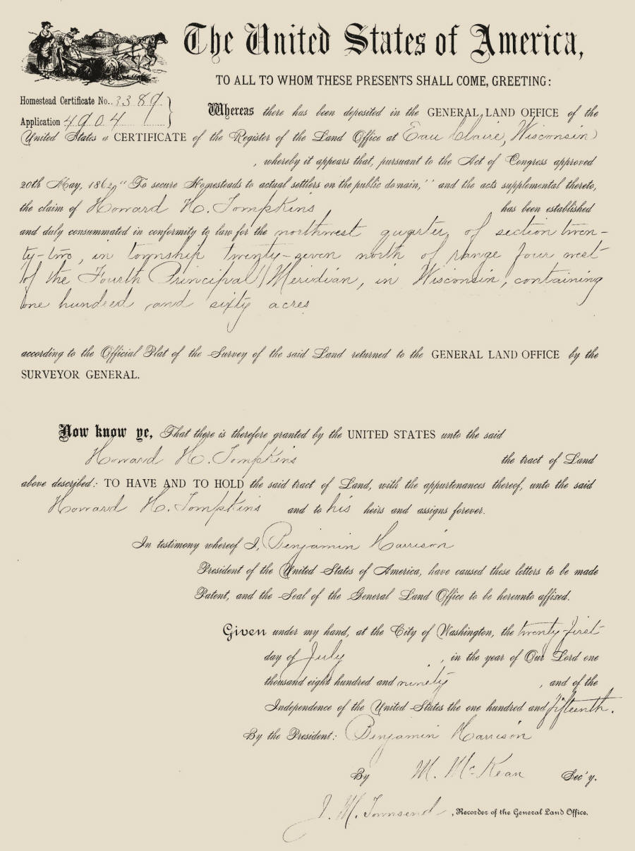 Eliza Melissa Coleman was born in Sussex, Eng. in 1847, and arrived in Hamilton NY with her parents when she was 6 yrs. old. She married Howard 8 Oct 1884 in Chicago, and the couple settled in Warner, Clark Co., WI, where their son Marcus H. was born, 19 Jul 1885. Howard had a property sale during Aug 1889 and traded his farm to L. O. Garrison for the Randall farm ½ mi. N. of Greenwood. Then, 21 Jul 1890 the Tompkins were granted a homestead at the Eau Claire Land Office for sec. 22, Butler Twp. This was in the midst of a Great Depression and the collapse of the American economy which hit the farm states such as WI the hardest. This was coupled with a period of unusually harsh weather, but the Tompkins made it through that first year on their homestead despite a whopping 72" snowfall for the season. The next winter they were not nearly so fortunate, but their problem wasn’t money or weather, it was the dreaded epidemic of Typhoid Fever that was sweeping the county to claim victims. Eliza was one of them and when her condition was complicated with pneumonia, she died 29 Jan 1892 and was buried in the Thorp Village Cemetery.