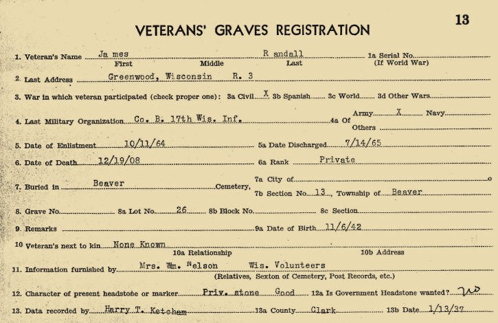 Name: James Randall Residence: Weston, Wisconsin Enlistment Date: 10 Nov 1864