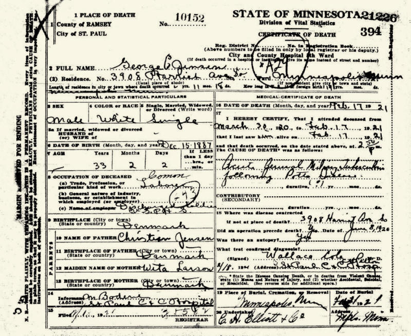 Name: George C Jensen Death Date: 17 Feb 1921 Death County: Ramsey