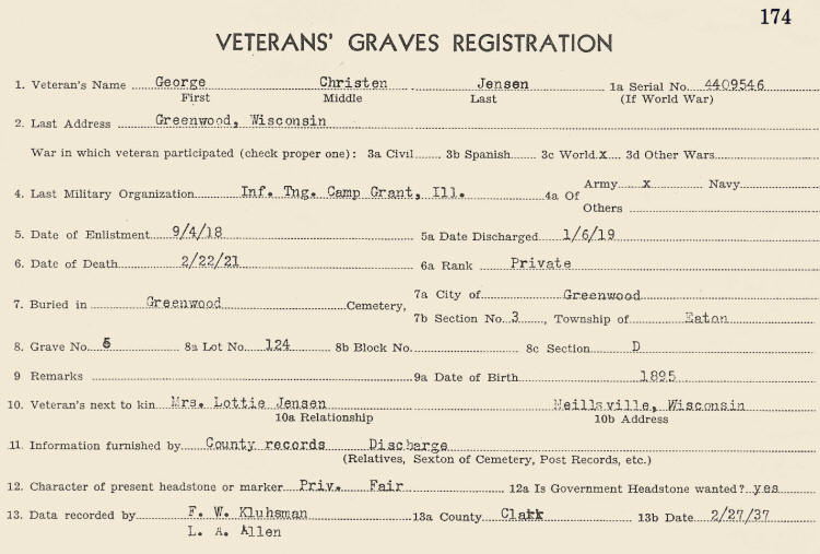 Georg was born 15 Dec 1887 in Denmark, the son of Christian and Wita (Larson) Jensen. He fought in WW I, enlisting 4 Sep 1918 and serving until 6 Jan 1919. Pvt. Jensen was single, and average height and medium build. His eyes were blue and he had light colored hair. After the service, he worked as a common laborer and lived at 3908 Harriet Ave. South, Minneapolis Minnesota. He died 22 Feb 1921, unmarried, at the County Hospital in St. Paul when he was thirty-three years old after suffering with Potts Disease which was complicated with Tuberculosis. He is buried in the City Cemetery of Greenwood, Wisconsin. His father died in 1907 and his mother died 4 Dec 1928 at her home in Nykobing, Denmark at the age of seventy-four. In 1925 his brother, Alfred made a trip back to his old home in Denmark to visit her. It is sad to think George could not accompany him.