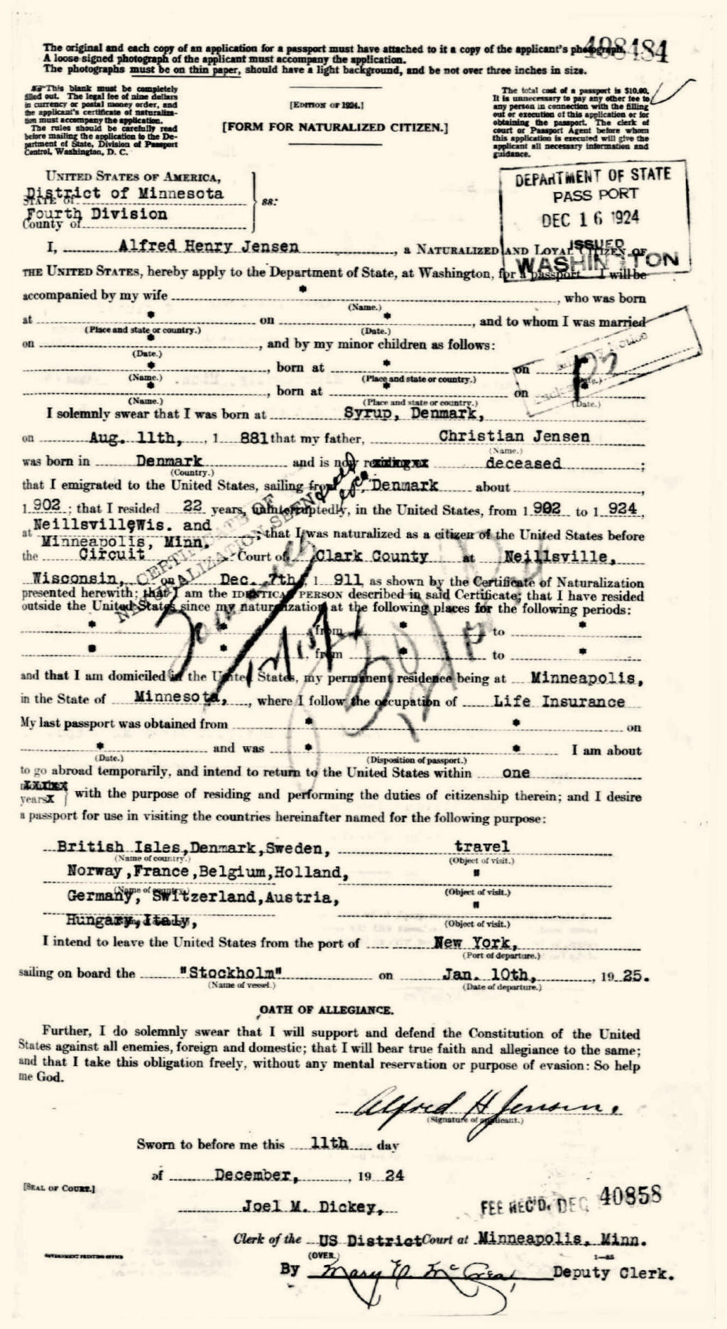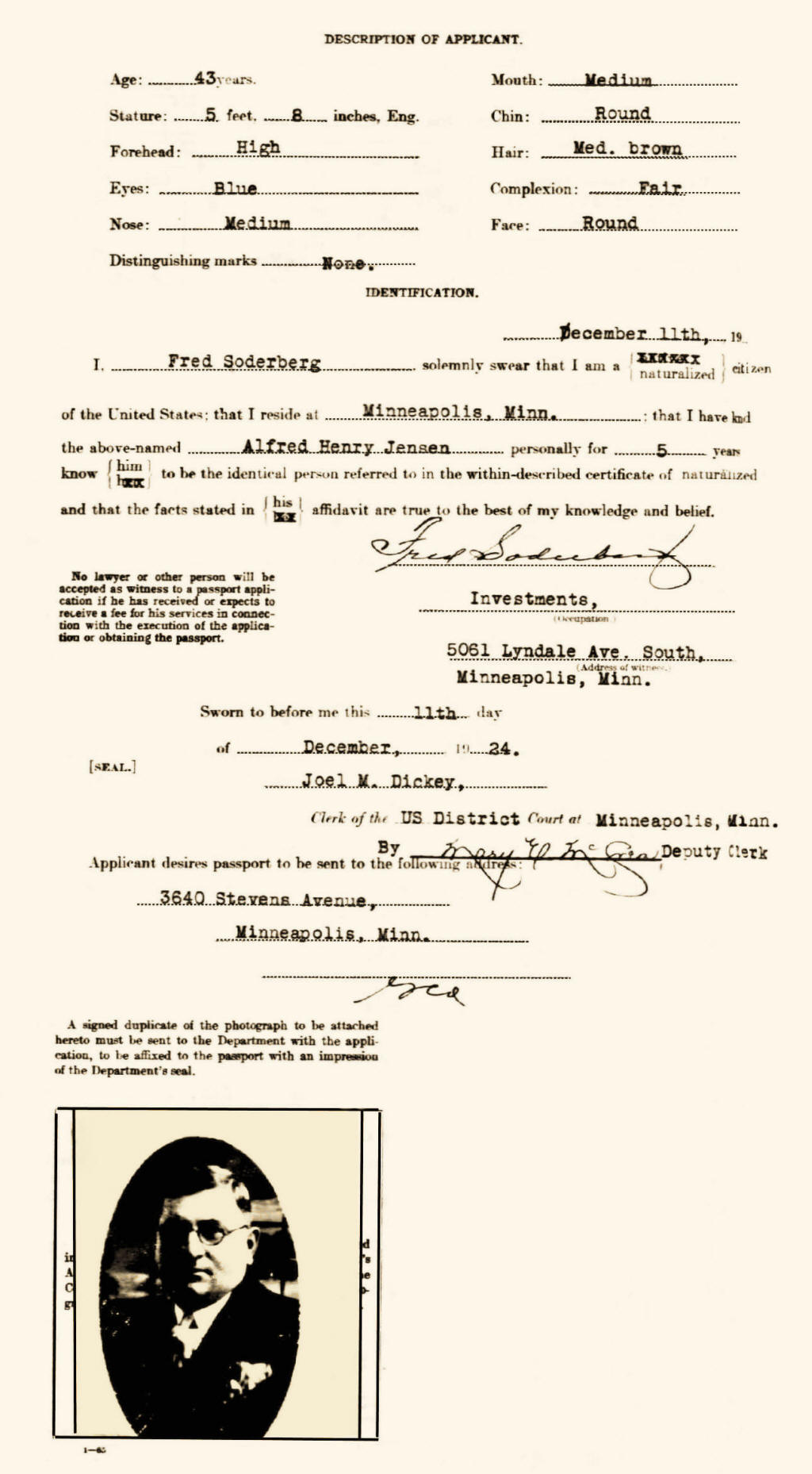 Alfred applied for a passport to travel to the British Isles, Denmark, Sweden, Norway, France, Belgium, Holland, Germany, Switzerland, Austria, Hungary and Italy. It was issued in Washington, D. C., 16 Dec 1924 and he left for his trip from the port of New York, sailing on board the "Stockhholm", 10 Jan 1925. At that time he was 43 years old and stood 5'8" tall. He had high forehead, a medium nose and mouth, a round chin, round face and a fair complexion. His eyes were blue and his hair was medium brown in color. During this trip he visited his mother who died in Denmark. Wita passed away at her home in Nykobing, Denmark at the age of seventy-four, 4 Dec 1928.
