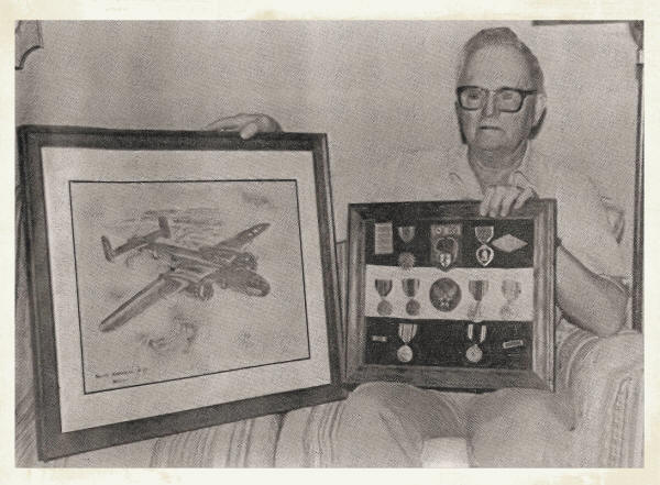 Clarence Meinhardt of Greenwood holds a drawing of a B-25 bomber like the one he was in when shot down over Egypt in 1942.