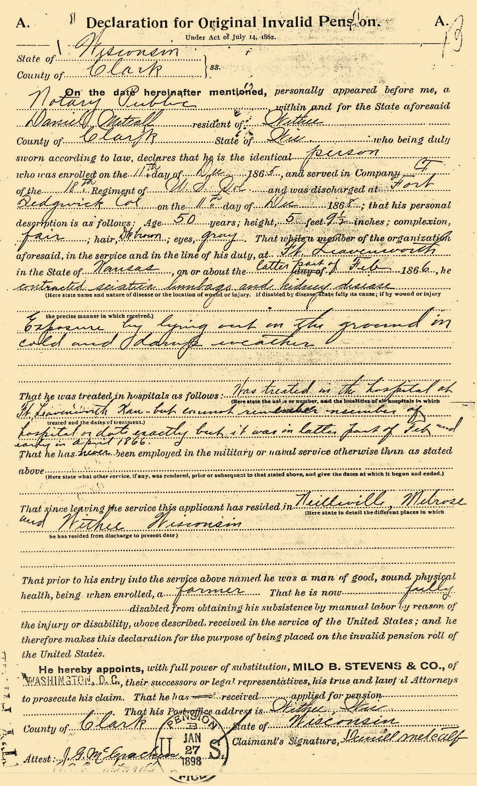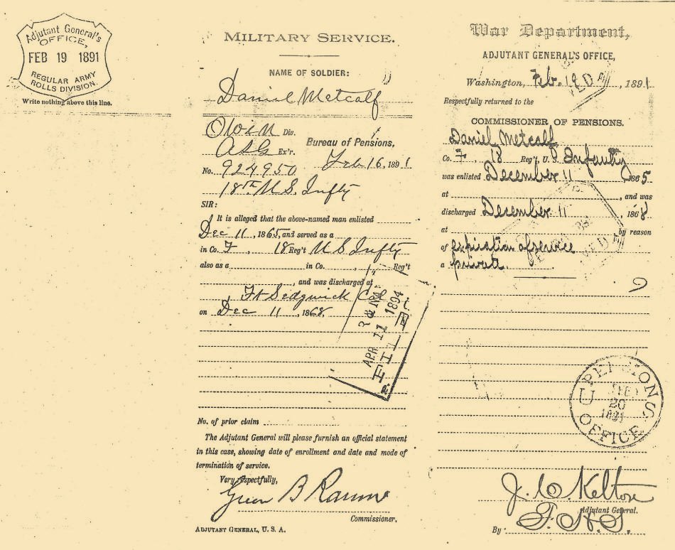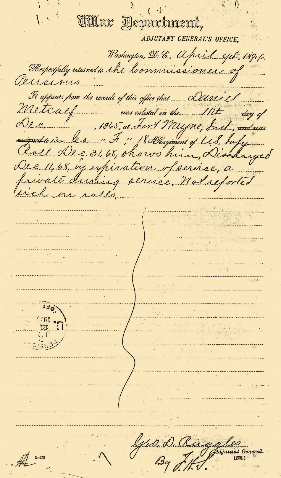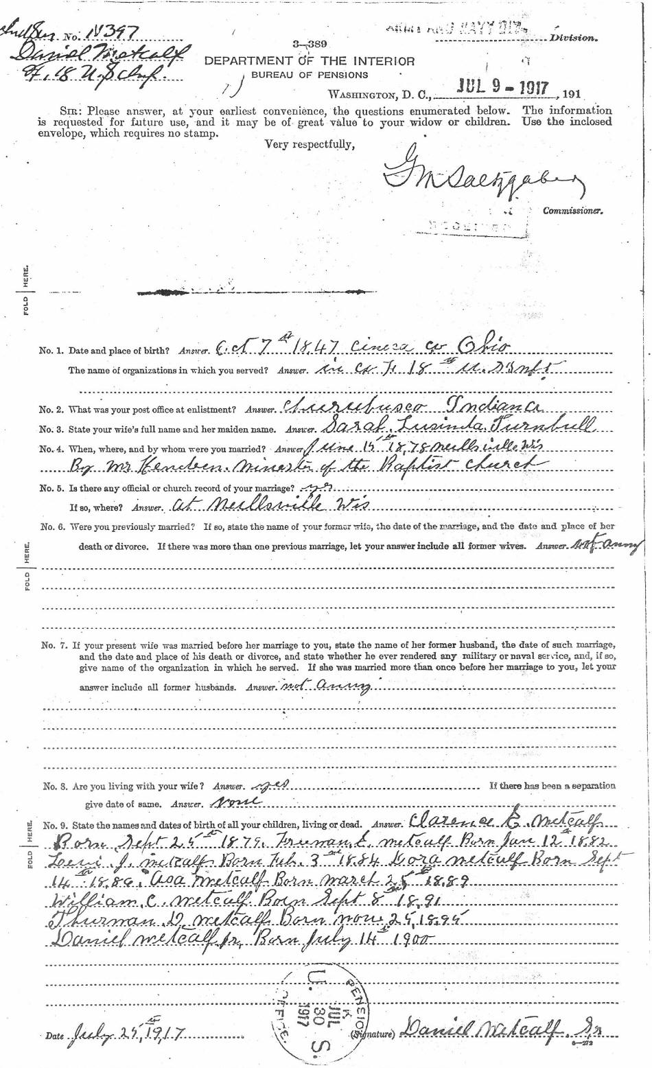 Daniel was born 7 Oct 1847 in Cineco Co., Ohio, the son of Nelson and Eliza Metcalf. Daniel's parents were both natives of Pennsylvania.