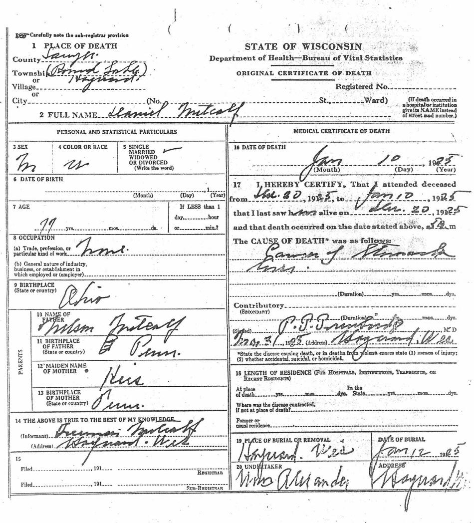 Daniel died of stomach cancer, 10 Jan 1925, in Hayward, Wis. and was buried there. Sarah died 24 Jun 1930 at Round Lake, Sawyer Co., Wis. at the age of 68 yrs.