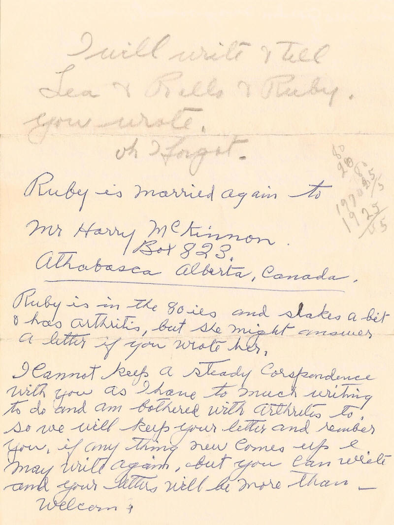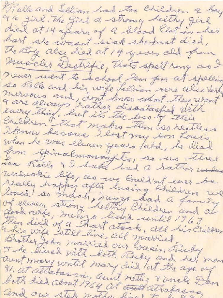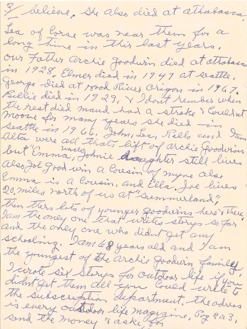Olive’s mother, Clara Clark Goodwin, died in 1910 near Athabasca, Alberta, Canada as the result of an epileptic seizure leaving 9-year old Olive and several of her siblings motherless. Clara was buried in an unmarked grave on the farm Archie was renting at the time. When Olive visited the area many years later she found the burial site had been plowed, planted with grain, and there was no longer any way to determine the actual place her mother had been buried.