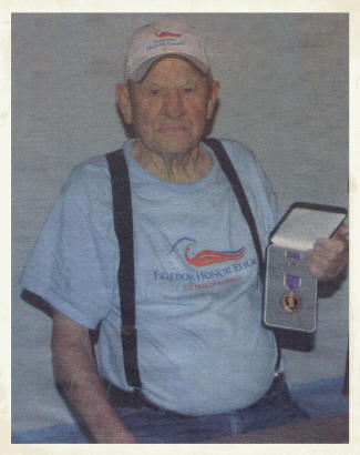 Neillsville area resident Ted Janicki, sporting his Freedom Honor Flight T-shirt and cap, displays the Purple Heart medal he was awarded for his military service during World War II. Janicki participated in The Freedom Honor Flight to Washington, D. C. Oct. 10 with other WWII veterans to view the World War II Memorial and other memorials. (Photo by Peter Spicer/Clark County Press)