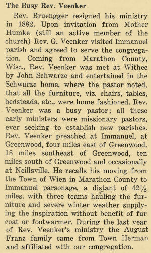 Rev. Bruengger of the Warner, WI Evangelical & Reformed Church resigned his ministry in 1882 and was replaced by Rev. Gerrit Veenker (later changed to George) of Marathon County, WI. He'd previously ministered in Pleasant Valley, Grundy, IA. He and his wife Bertha and sons, Ralph G., Hermann moved to the heavily wooded church community and stayed until 1884 when Rev. C. Busch assumed the leadership of the growing flock.