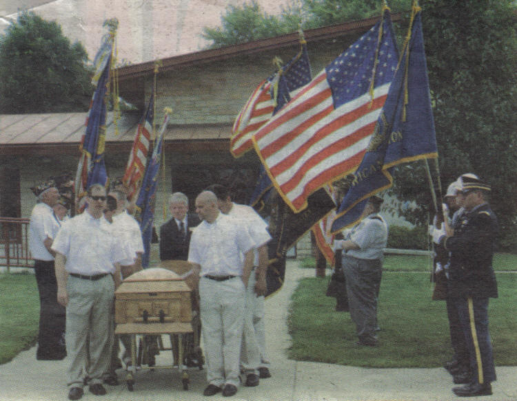 An honor guard lined the walk at the Black River Falls Evangelical Lutheran Church July 14 when the casket bearing Elmo Johnson was escorted from the church. Johnson was a veteran of World War II and a well-known entertainer in the area. He is especially recognized for his dedication to veterans through his service at their funerals. Johnson has played "Taps" for over 1,000 veterans’ funerals. (Photo by Pat McKnight/Banner Journal)