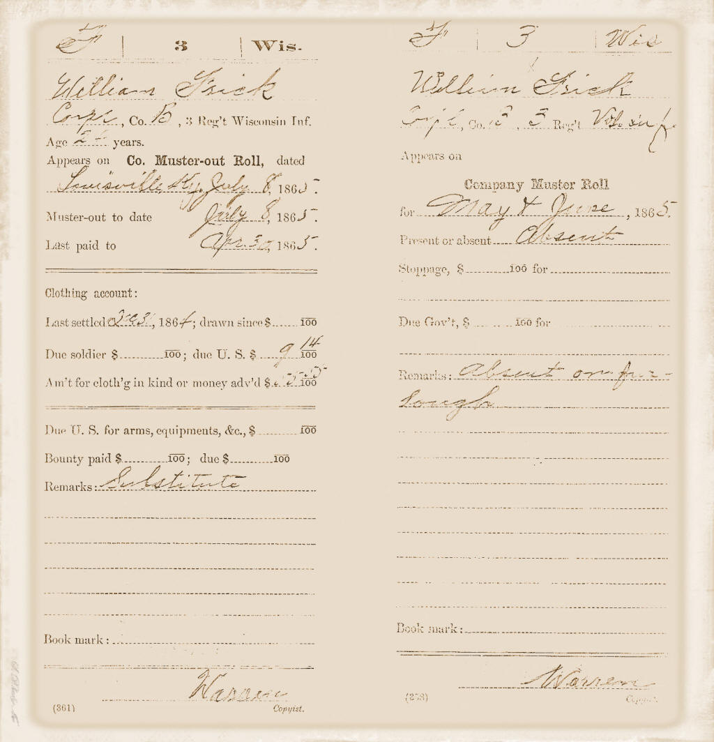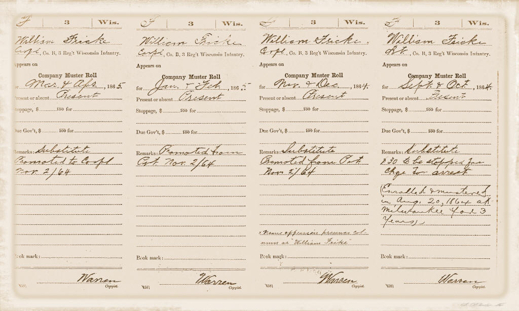 Fricke, William--Union Infantry, Co. B, 3rd Regiment, Wisconsin Infantry. Muster Roll [1] [2] [3]