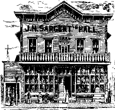 The cut to the left represents the front of the principal opera hall in Thorp. It is owned and managed by J. H. Sargent and his son, H. F. Sargent, the latter being the local manager. The firm of J. H. Sargent & Son was organized in 1884. The senior member of the firm is a real estate dealer in Taylor county, and the firm is largely interested in ral estate in this county. They own a large quantity of farm and timberland in the county besides several village lots in Thorp. The lower story is occupied as a saloon. It is a quiet and well managed place and probably the largest place of the kind in this section of country. The hall is neatly furnished, well ventilated and has a seating capacity of about five or six hundred. All town meetings are held in this hall, also all of the first-class entertainments, lectures, etc., and even church services are sometimes held here. The senior member of the firm is a native of Vermont. H. F. was born in this state. He has been chief of the Fire Department in Thorp for three years and manager of the Thorp Baseball Club for the same length of time. Both members of the firm are members of the F. & A. M. order and also of the I. O. O. F. J. H. Sargent was a soldier in the late war and H. F. belongs to the Sons of Veterans. ("Clark Co., Illustrated" by Saterlee, Tifft & Marsh; 1890). |