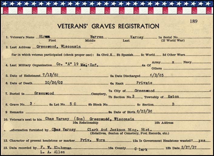 HIRAM W. VARNEY was born June 23, 1836. He enlisted with Co. "A" in the 19th Regiment of the Wisconsin Infantry on July 13, 1862, serving as a Private and was discharged June 3, 1865. He died October 26, 1902 and is buried in the Greenwood, Wisconsin City Cemetery. His son, Charles Varney of Greenwood, Wisconsin was listed as his next of kin on his grave registration.