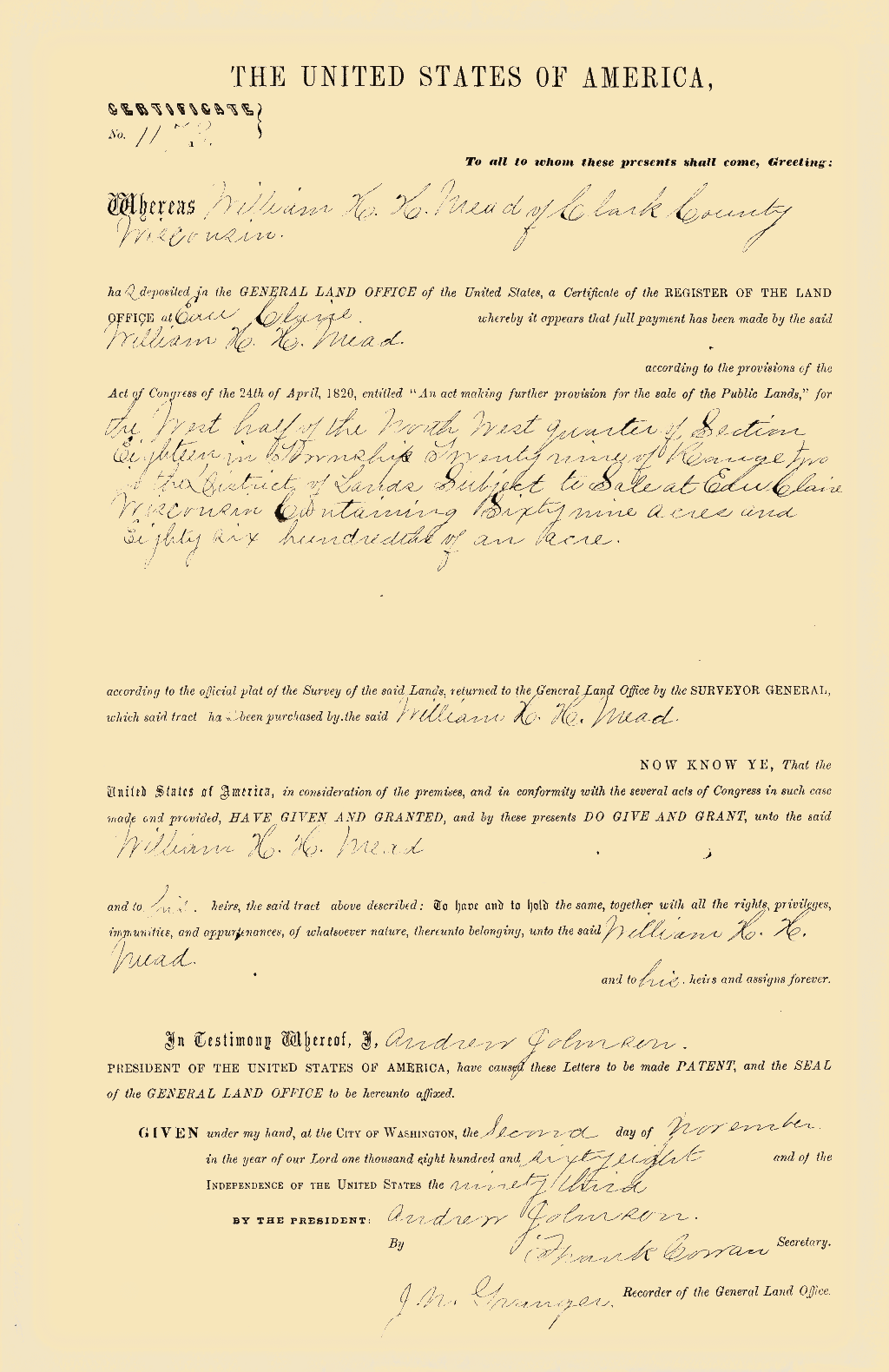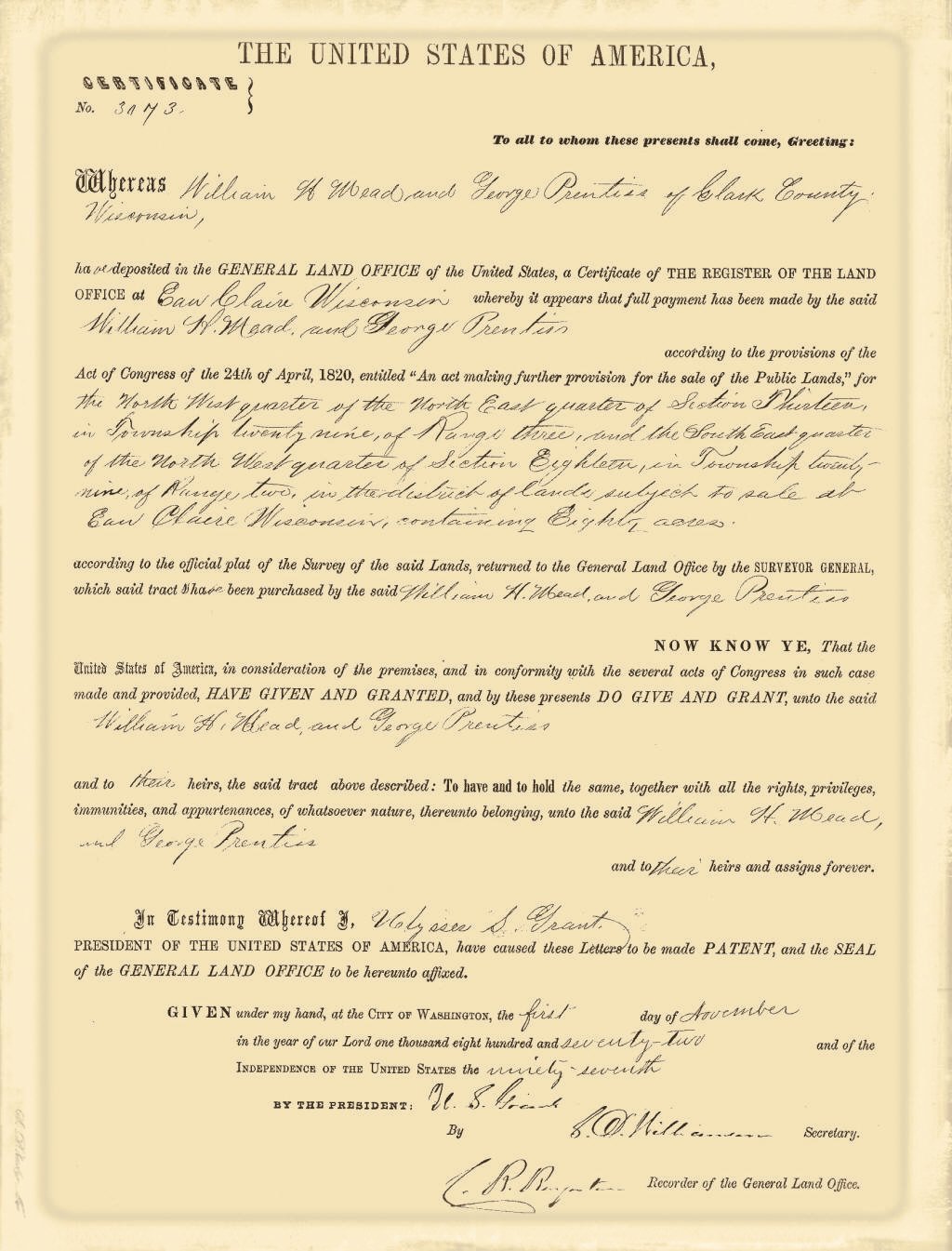 In 1865 Mr. Mead came with his wife and two children to Clark County, locating first at what is now the city of Greenwood, where the family resided until the following spring. He then took a homestead of 160 acres of wild and heavily timbered land in that part of the county now known as Warner Township, where he erected a modest dwelling and began the strenuous life of a pioneer farmer. The growing importance of the timber industry, however, soon attracted his attention and led him to change his occupation, as he saw that it was easier at that time to extract wealth from the forests than from the soil. Accordingly he invested in timber lands and for the next twenty years was known as one of the leading loggers and lumbermen of this part of the state, at one time, in partnership with others, owning as much as 10,000 acres of land. After that he resumed farming, clearing and improving about 200 acres, and remaining on his farm until about the year 1900. He was also employed as agent by the Gates Land Company and continued with them until 1902, when he again resumed farming, this time on a farm two and a half miles south of Withee. On this farm, which contained 224 acres and was the property of Mrs. Mead, he passed the rest of his life, a period of four and a half years, his death taking place Mar. 6, 1911. He had for a long time been one of the leading men of his township, serving as chairman of the town board for fifteen years, and by virtue of that office was a member also of the board of county commissioners, which he served as chairman for three years.