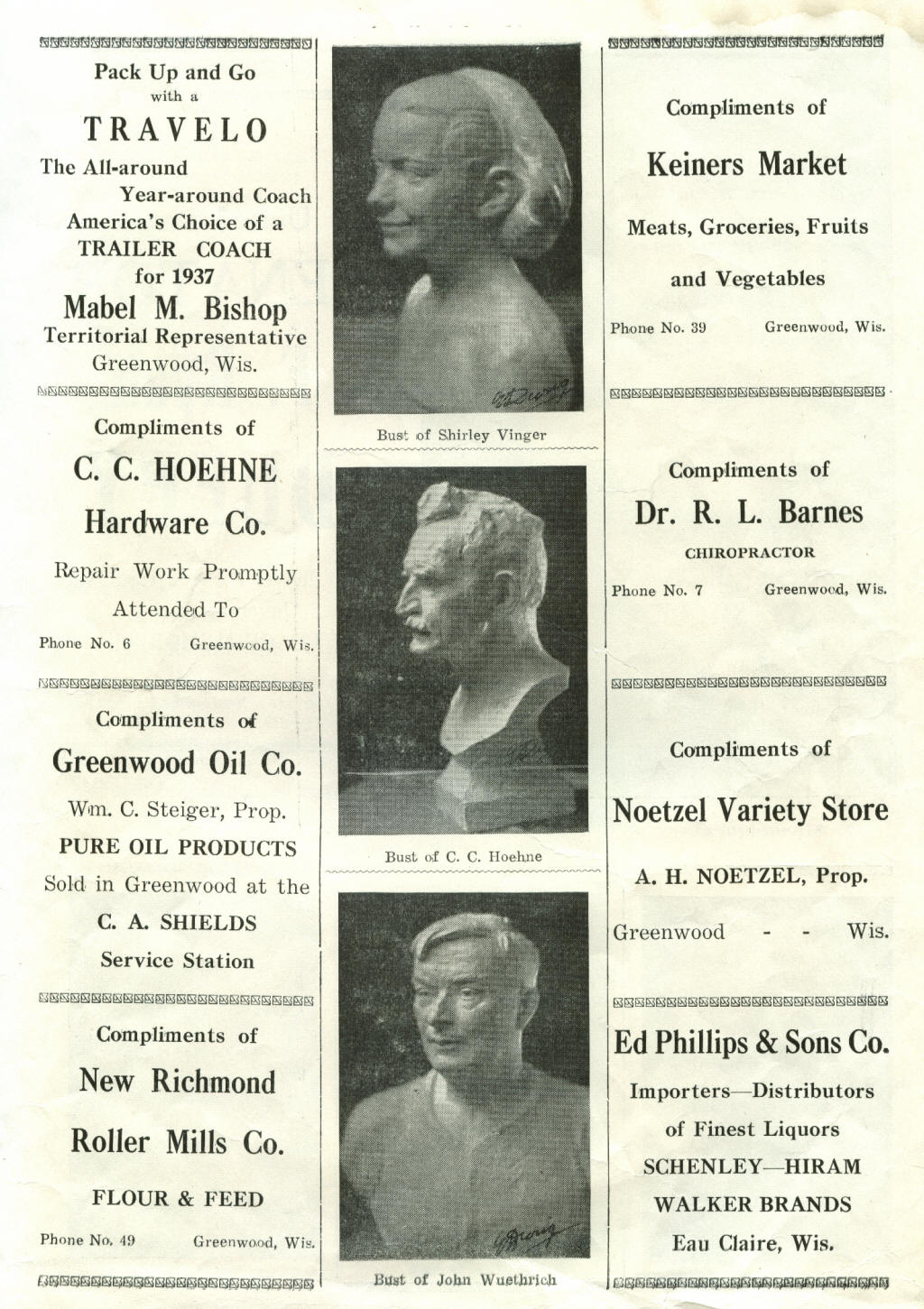 John Wuethrich belonged to the prestigious Greenwood Commercial Club and was "Toastmaster" for the Banquet held in honor of the unveiling of the Peace Monument given to the city by Ernest Durig in 1937. He was also one of the area residents who had a bust made by the artist.