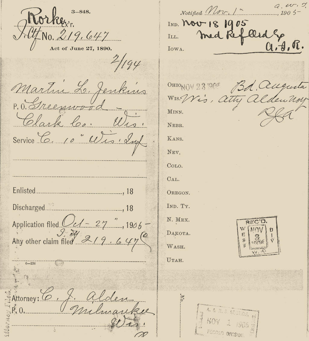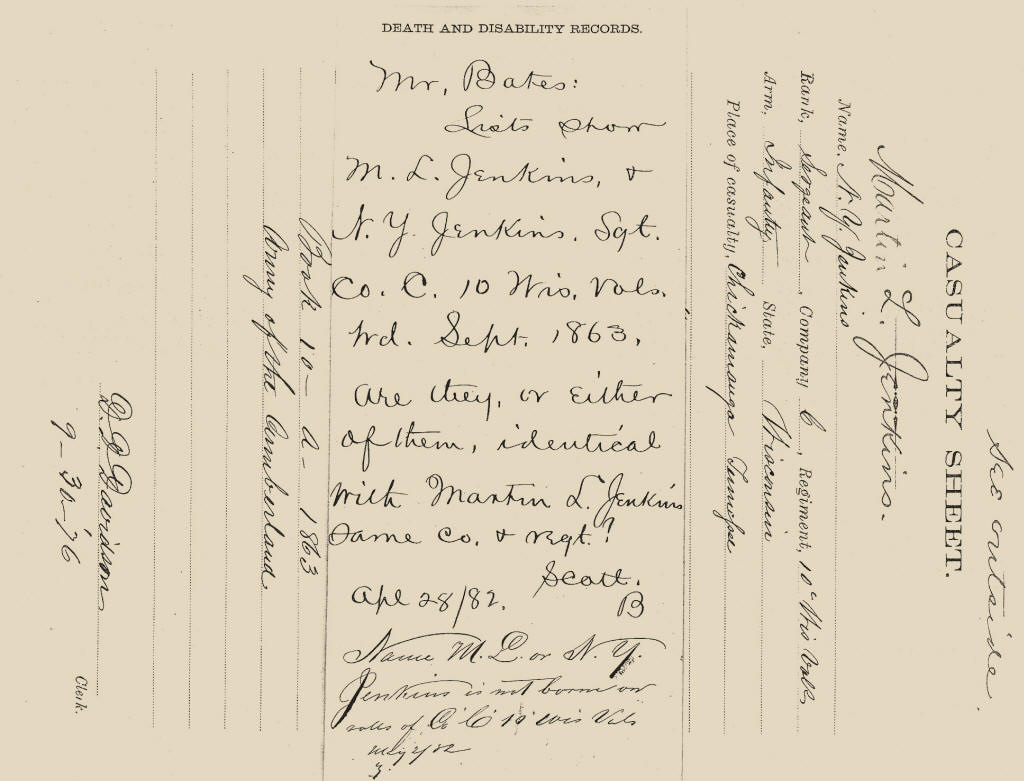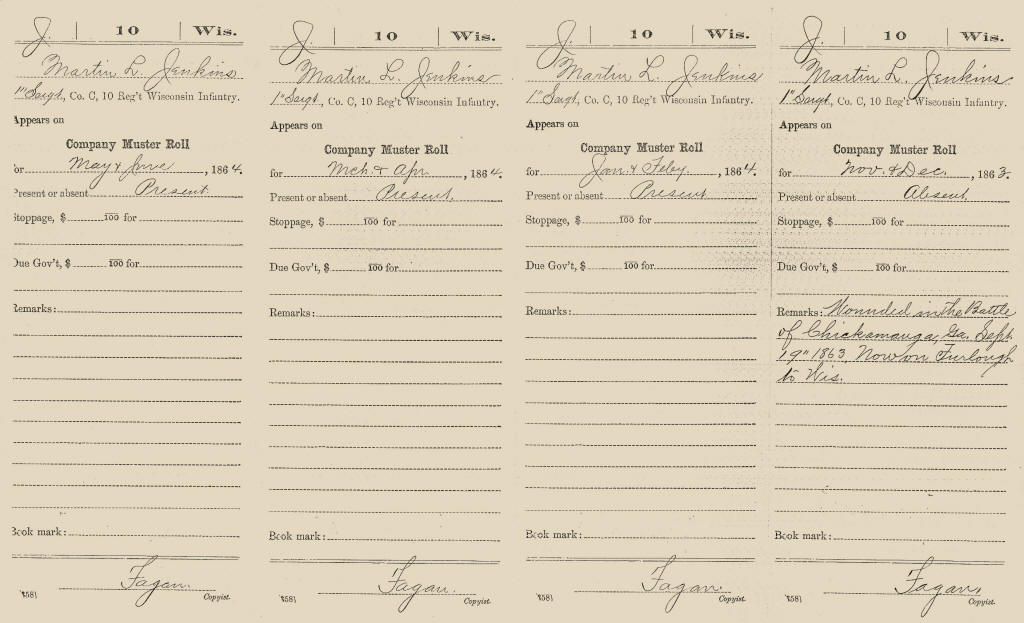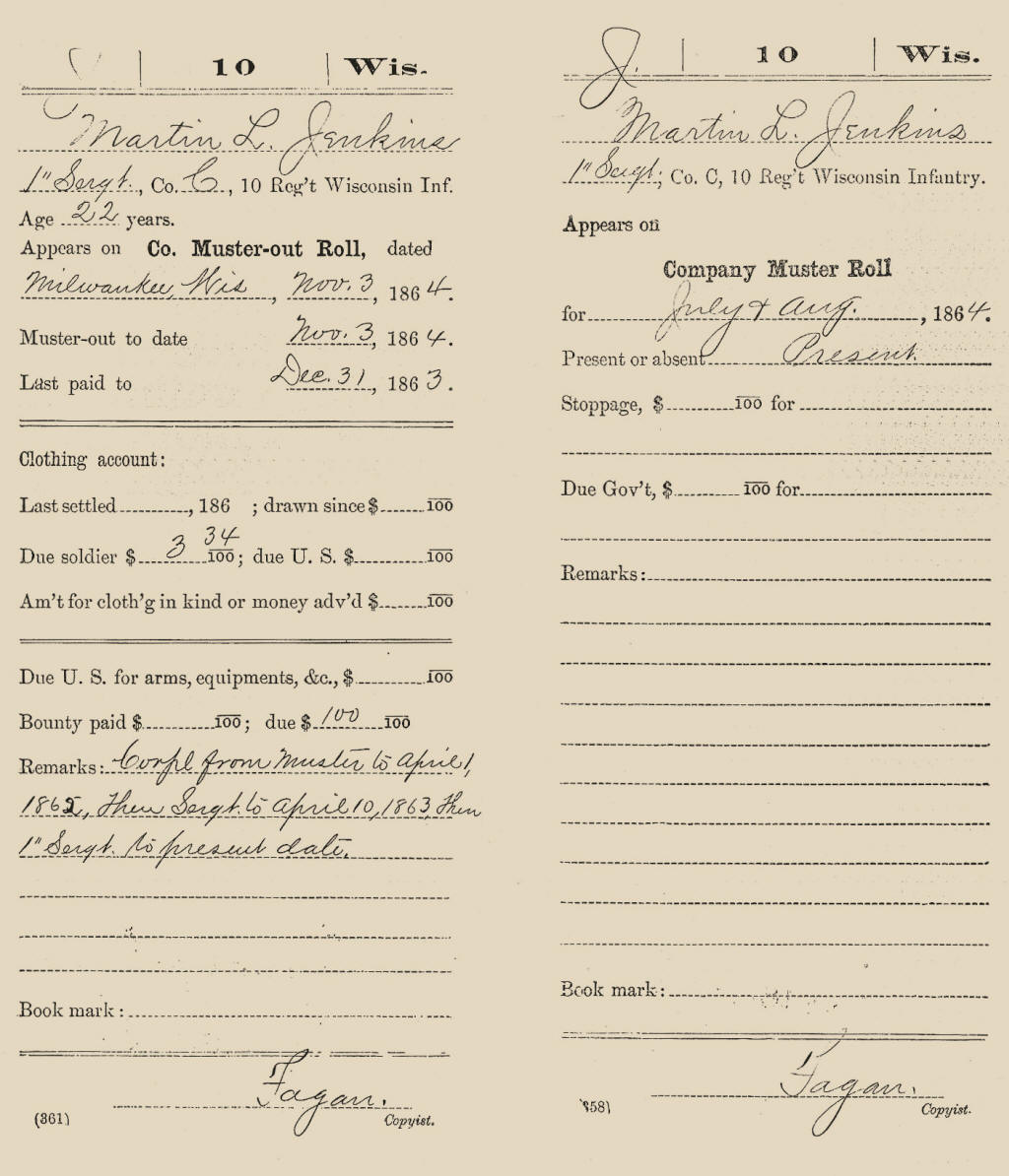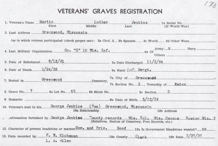 Martin Luther Jenkins was born May 22, 1839. He enlisted with Co. "C" of the 10th Regiment of the Wisconsin Infantry on September 12, 1861 serving as a 1st Sergeant and was discharged November 3, 1864. He died February 24, 1928 and is buried in the Greenwood, Wisconsin City Cemetery. His son, George Jenkins, of Greenwood, Wisconsin was listed as his next of kin on his grave registration.