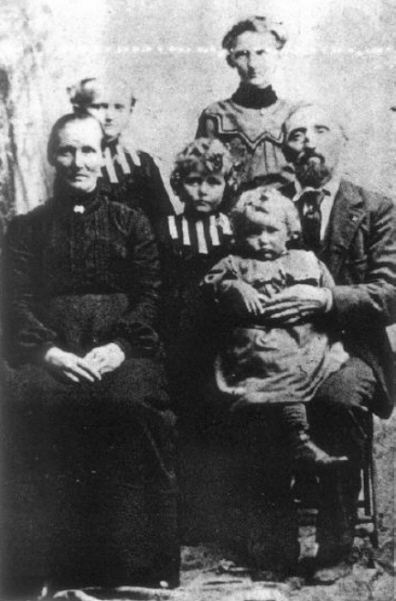 Oluf and Sina Thompson, (back row) Clara and Mina, Thea on lap. Alma, Esther and Alfred (Tommy) yet to be born. |