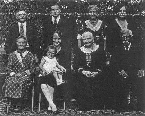 Three groups of four generations in the Kraut Family, Curtiss are shown here. (left to right, front row) Mrs. Josef Kraut, 75, Betty Kraut, 2, Mrs. Franlin Kraut, 21, all of Curtiss; Mrs. Louise Horn, 84, Greenwood, WI; and Gottlieb Kind, 86, Curtiss. (top row) Frank Kraut, 50, Franklin Kraut, 21, Mrs. Christ Karsten, 54, and Mrs. Frank Kraut, 44. Divided by groups of four generations in each, naming the oldest first, they are: Group 1 - Mrs. Josef Kraut, Frank Kraut, Franklin Kraut, and Betty. Group 2 - Gottlieb Kind, Mrs. Frank Kraut, Franklin Kraut, and Betty. Group 3--Mrs. Louise Horn, Mrs. Christ Karsten, Mrs. Franklin Kraut, and Betty. The Kraut family came from Koenigswald, near Karlsbad, in Bohemia, direct to Curtiss in 1892. |
