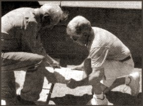 Bob Beyer (left) and Kirk Rodman, The Highground’s volunteer general manager, carefully place Beyer’s Legacy Stone in the ground.