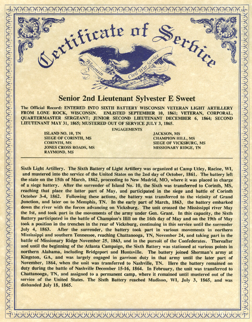 Sylvester was a native of Leeds Co., Ontario, Canada, born 18 Nov 1838, the son of Abijah and Mariah (Rhodes) Sweet. In 1845 his parents moved the family to Southport, WI, going to Portland, Dodge Co., 2 yrs. later, and in 1854, to Bear Creek, Sauk Co. Sylvester and his brother, Albe, enlisted 10 Sep 1861 with the 6th Batry., Wis. L.A. Their brother Nicholas joined the same unit in 1864. Sylvester participated in 9 campaigns, suffering a gunshot wound to the head at Champion Hills, June 1863, and was promoted to Full 2nd Lt. All 3 brothers were honorably was discharged 3 July 1865. Sylvester first married Achsa Perry, the daughter of Daniel T. and Salome (Burdick) Perry, at Marble Ridge, WI, 20 Feb 1866. In 1872, after studying at Wayland Academy, Beaver Dam, Sylvester graduated as an ordained minister of the Regular Baptist Church and began preaching at DeSoto, WI. He served as Pastor of the Beaver Dam Church 2 yrs., and supplied the pulpit of the Randolph Church for a considerable time. His charge of the Trempealeau Church lasted 3 yrs. and the Monticello Prairie Church 2 yrs. before moving to Elkhorn in Nov 1879. The Sweets were the parents of 6 children: Lewis Elmer Perry (3 Feb 1868 -1 May 1945), George E. (b. 1873), Emma E. and Ella E. (twins, b. 1877), Arthur L. (Mar 1885), and Gertrude (24 Sep 1886). Achsa passed away 7 Feb 1903 and was buried at Walnut Hill Cemetery, Baraboo, Sauk Co., WI. Sylvester was married to Margaret "Mary" (Foster) Dingley, 19 Jun 1910 in Greenwood by Rev. E. D. Edmunds of Beaver Dam. Sylvester died 6 July 1917 and Mary passed away 19 Oct 1926. They are buried in the Greenwood, WI City Cemetery. Civil War Soldiers in the Heart of Clark Co., Wisconsin