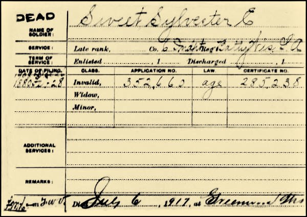 Sylvester Elmer Perry Sweet was born November 18, 1838. He enlisted with the 6th Battalion, Light Artillery for Wisconsin on September 10, 1861 serving as a 2nd Lieutenant and was discharged July 3, 1865. He died July 6, 1917 and is buried in the Greenwood, Wisconsin City Cemetery. His daughter, wife of Dr. Currie of Greenwood, Wisconsin, was listed as his next of kin on his grave registration.