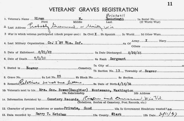 Hiram Britnall died July 1, 1910 and was laid to rest in the Beaver Twp. Cemetery, Clark County, Wisconsin.