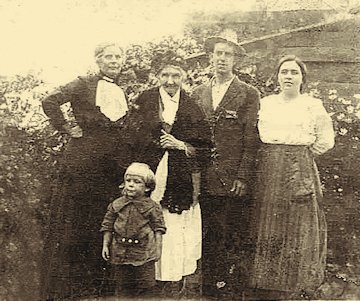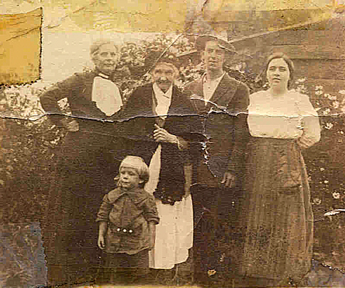 Cathern (Badger) Wilms and daughter Carrie (Wilms) Shean and son of Carrie, Ross Shean and Ross' wife Velma (James) Shean and (little boy) their son Donovan Shean. Photo taken at Carrie Shean's homestead in Colby, WI. *Repaired Photo |