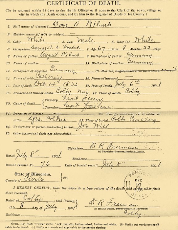 Boye A. Wilms was the Colby Druggist/Barber. Boye died of heart disease, July 6, 1901 and was buried in the Colby Memorial Cemetery, Clark Co., Wisconsin. His beloved wife, Cathern, was laid to rest beside him over nineteen years later, when she died Febuary16, 1920.