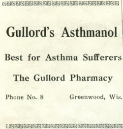 P. W. "Will" Gullord owned Gullord Pharmacy in Greenwood, Clark Co., Wisconsin and was a well known early resident. He was born December 12, 1884, the son of O. O. and Hannah (Wiedahl) Gullord. P. W. married Martha, the daughter of George and Marie (Scharmann) Zettler December 27, 1906 in Wood Co., Wisconsin. She was born in 1879.