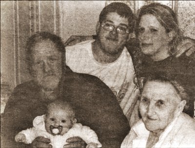 Great-grandfather Don Campbell (front, left) holding baby Alanna Campbell is seated next to Alanna's great-great-grandmother, Melba Campbell. Behind them are the baby's father, John Carteron (left) and grandmother Laurie Carteron. (Contributed photo)